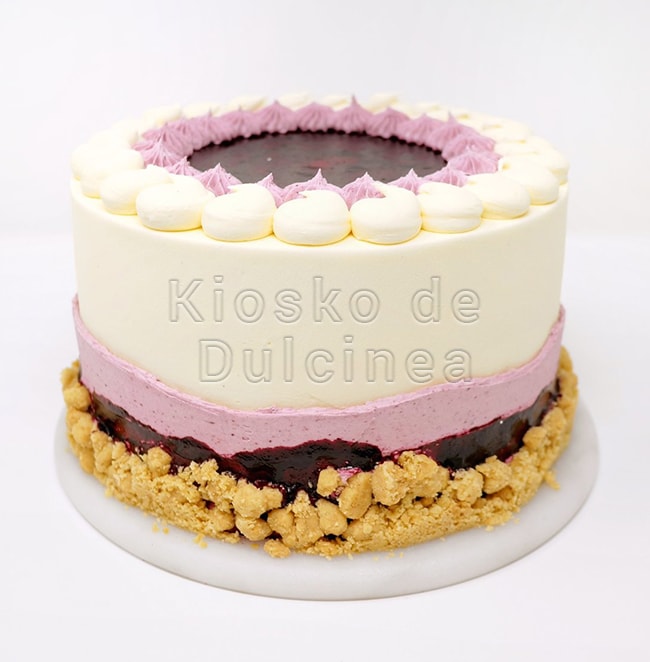 Deliciosa Torta de mora, con rellenos alternos de mora de arándanos frescos y glaseado de queso crema con pepitas de miga de pastel. Decorado con crema de mantequilla de vainilla y arándanos, más miga de pastel.